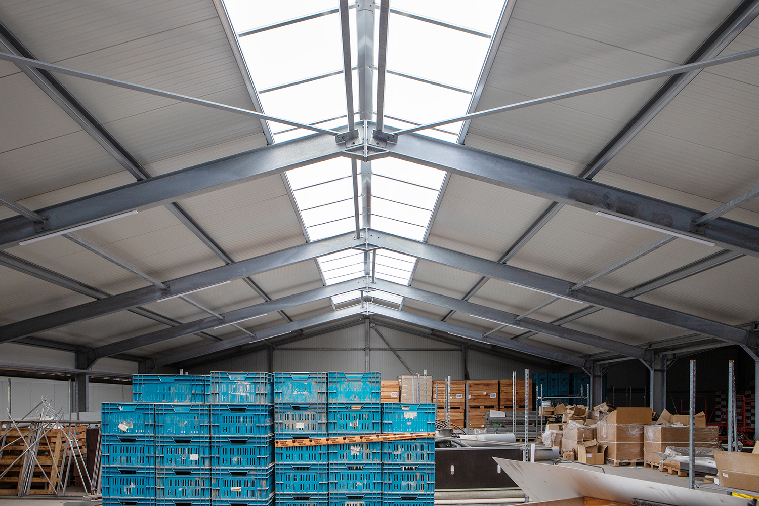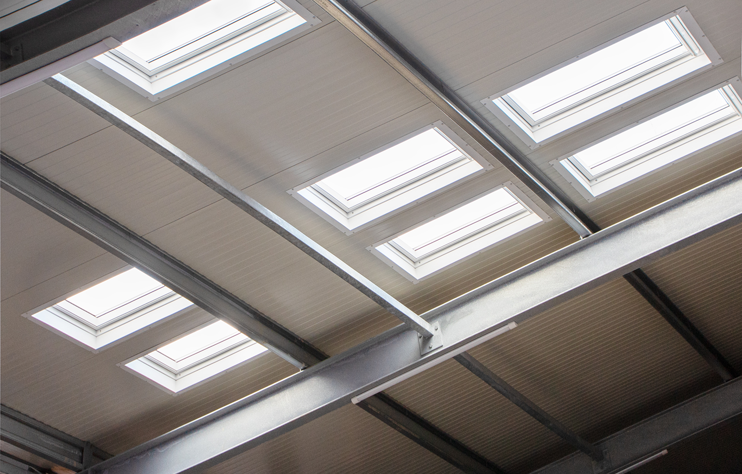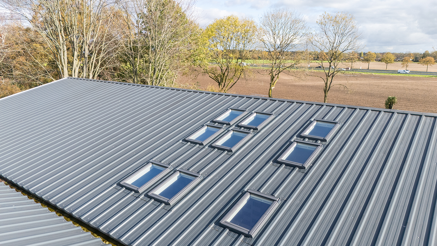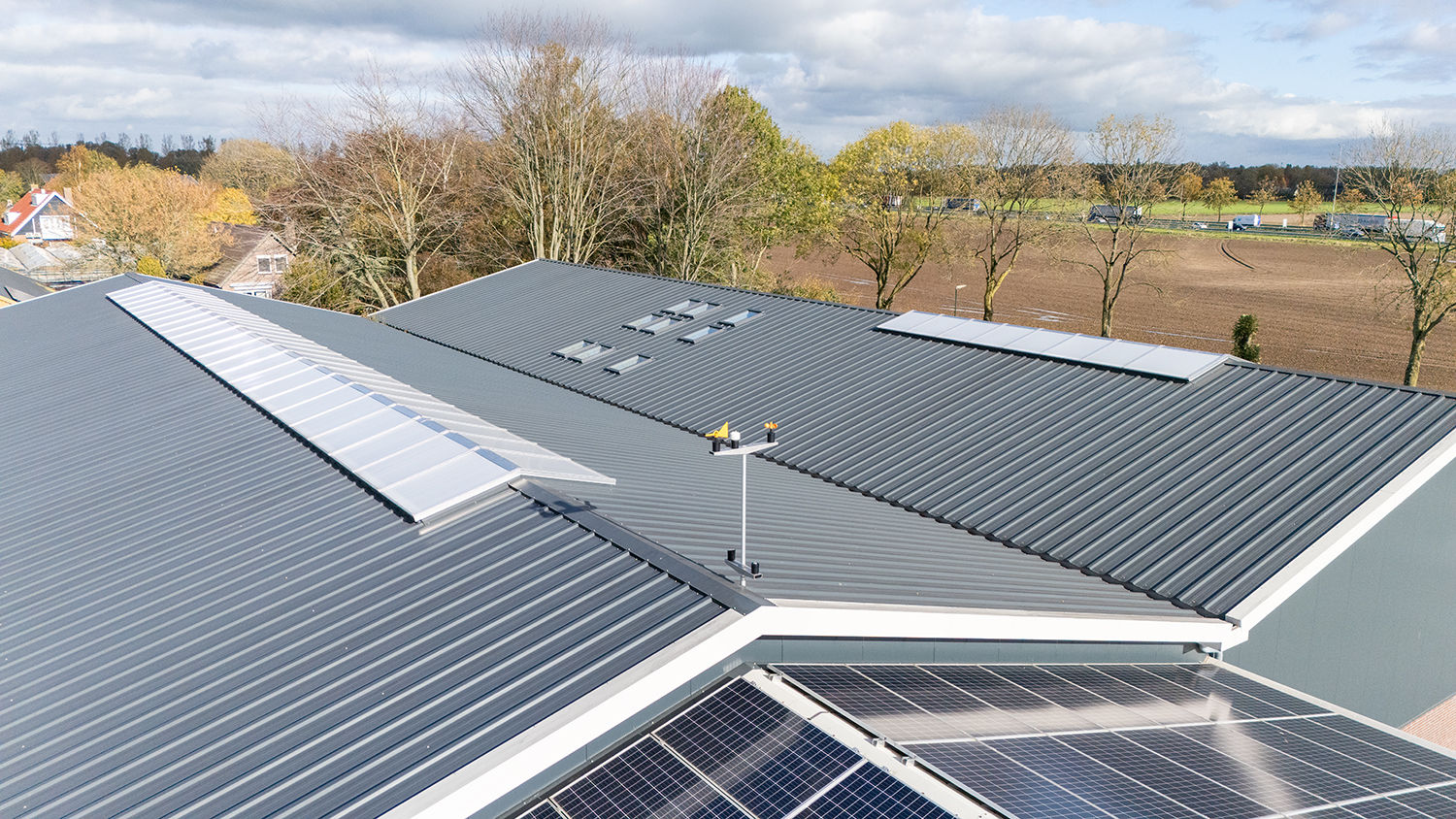 Daarnaast zijn op het dak meerdere VELUX dakramen in antraciet geplaatst. Bij deze ramen zijn ook de bijbehorende opstanden geleverd. De unieke combinatieset bestaat uit een opstand, een VELUX tuimelvenster en een buitenlijst in de kleur antraciet (RAL 7016), die perfect aansluiten op het FALK 1100 TR3+ dakpaneel. Hierdoor is de montage eenvoudig en ontstaat een strak en uniform eindresultaat.